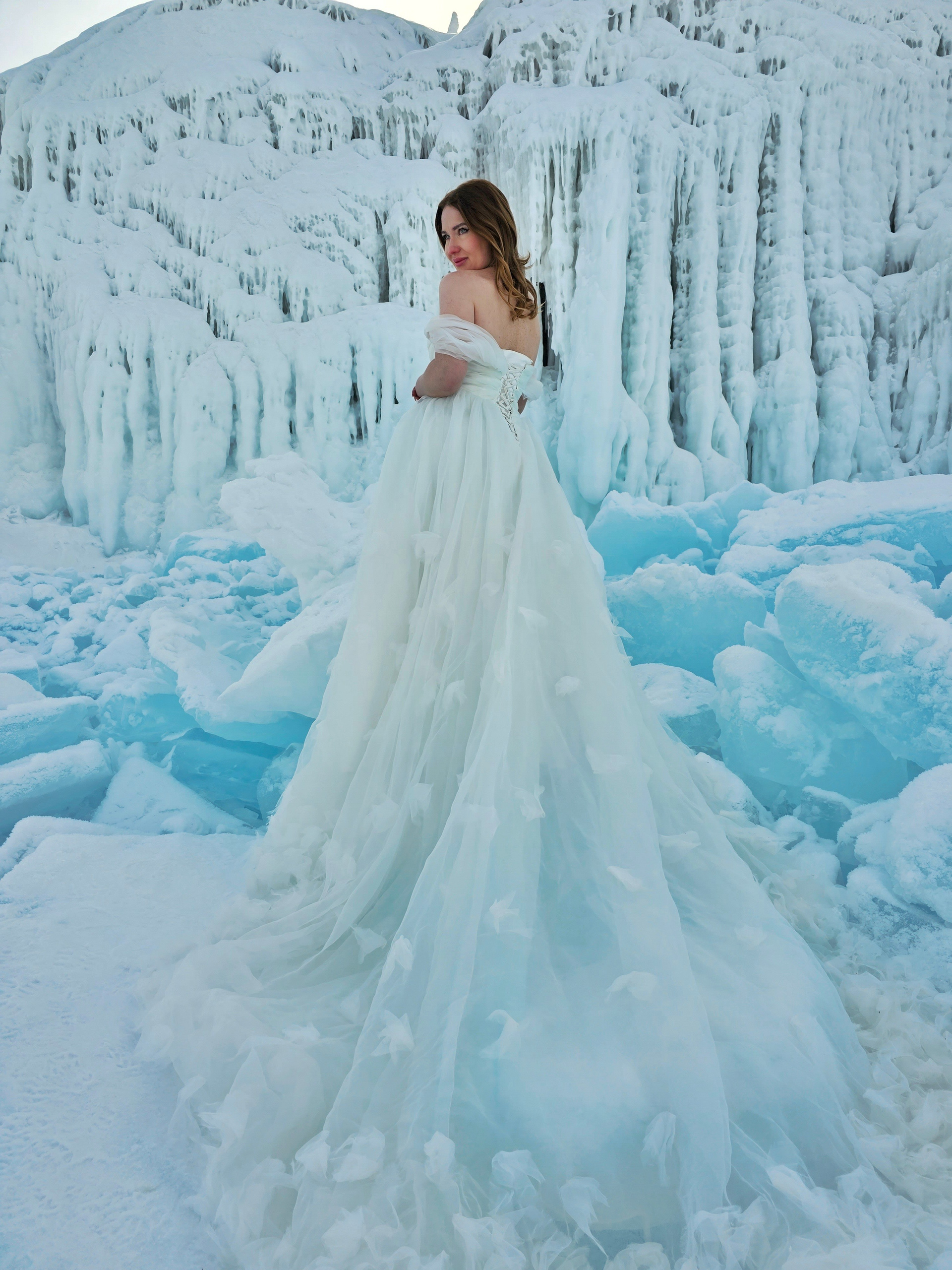 Платье фатиновое на корсете. Цвет — бело-бирюзовый с имитация льдинок на шлейфу. Размер 40-46